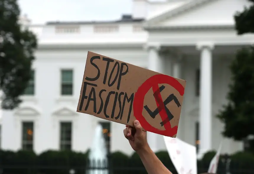 Um manifestante ergue um cartaz contra o fascismo frente à Casa Branca no rescaldo da violência em Charlottesville