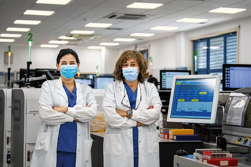Uma não trabalha sem a outra. Vanda Mota, virologista, e Lucília Araújo, coordenadora de diagnóstico laboratorial de covid do Centro Hospitalar Universitário de Coimbra (CHUC). Uma fica cara a cara com o vírus, a outra é o anjo da guarda da equipa. Das duas depende o funcionamento de um dos maiores hospitais do país, devido à necessidade da realização prévia de testes ao novo coronavírus.