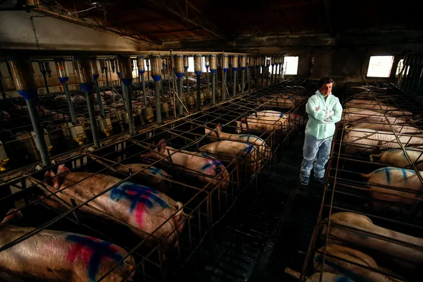 Nuno Cavaco produz cerca de 14 mil leitões por ano. Agora, com os restaurantes fechados, teve de engordar os animais para vender a carne, embora a um preço menos apelativo. Aqui, junto a algumas das 500 fêmeas na fase da inseminação artificial. Cada uma cria 29 leitões por ano